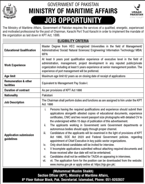 The Government of Pakistan, through the Ministry of Maritime Affairs Jobs 2025, is inviting applications from qualified and experienced individuals for the position of Chairman, Karachi Port Trust (KPT), effective from 2025. This is an opportunity for a senior leader to manage and implement maritime initiatives under the KPT Act, 1886.